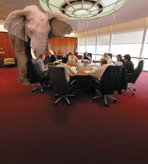 Le titre complet de la pièce “Etudes (the Elephant in the Room)” fait allusion à un rapport de l’OCDE (2009) intitulé “The Elephant in the Room : the Need to Deal with What Banks Do”. L’expression anglaise suggère que l’on refuse de voir et de discuter d’une évidence importante.