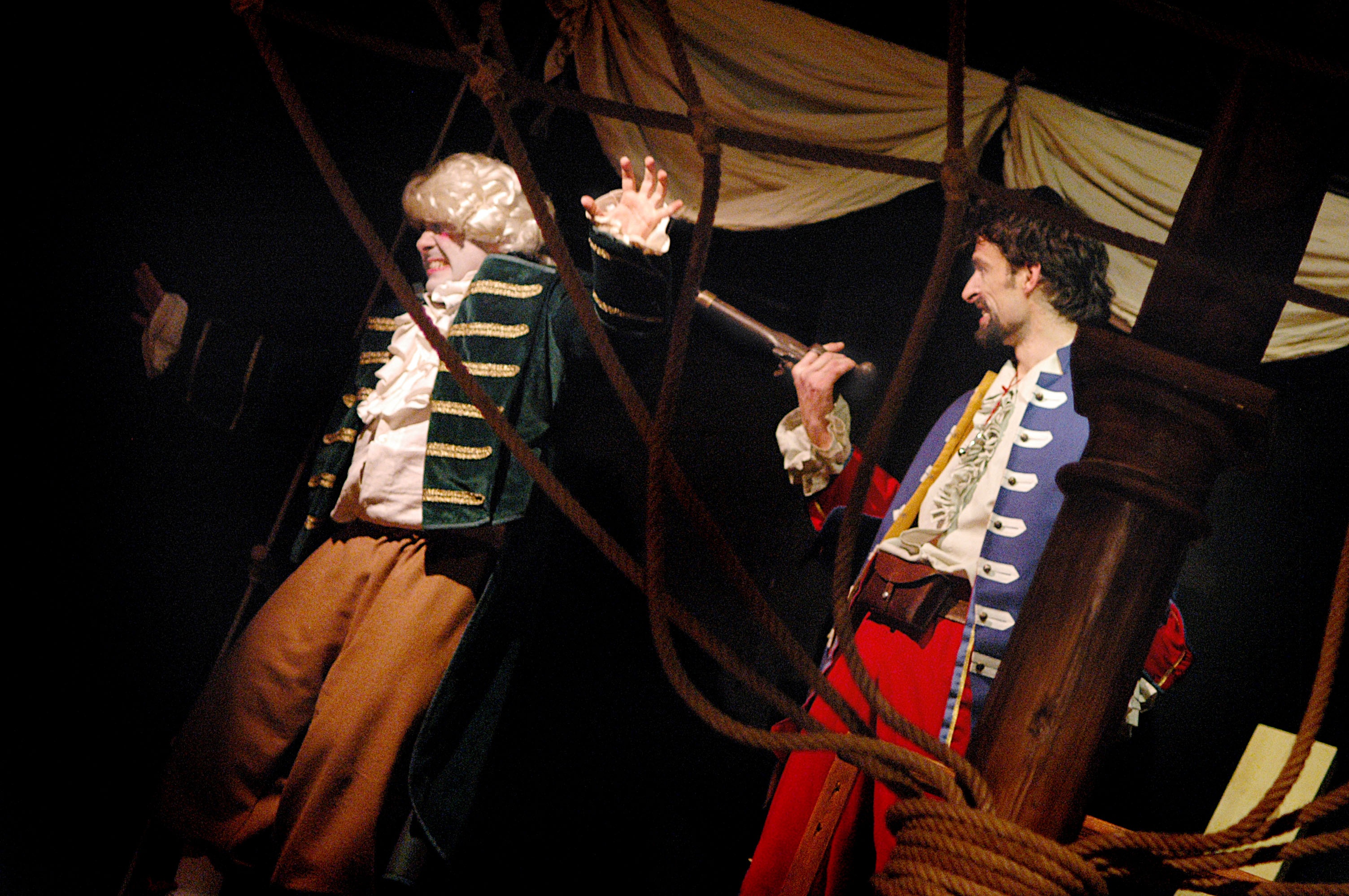 Le dimanche après midi, il y avait beaucoup d’enfants dans la salle, de trois à 12 ans, ils ont sans doute adoré les magnifiques costumes d’époque, l’embarquement sur le bateau à voiles mythique, la tempête mémorable, les combats de la mutinerie, l’abordage d’un bateau collègue, pirate lui aussi, et l’épisode de l’arche de Noé totalement burlesque pour arriver à Port au Prince et couler des jours heureux et candides. L’action débridée les a sans doute ravis et fascinés… Sirotant leur grenadine à l’entre acte dans un vrai bateau de pirates… au milieu des cordages, gaillard avant et arrière, filets, ponts et cabines en tout genre, ils pouvaient rêver de puissance et de liberté. Magique pour eux sûrement, et fort mystérieux. Ils sont conscients que les adultes possèdent certainement des clés encore interdites. L’assaut des mots, des calembours, allusions oiseuses, contrepèteries et autres figures de styles les ont sans doute laissés pantois.